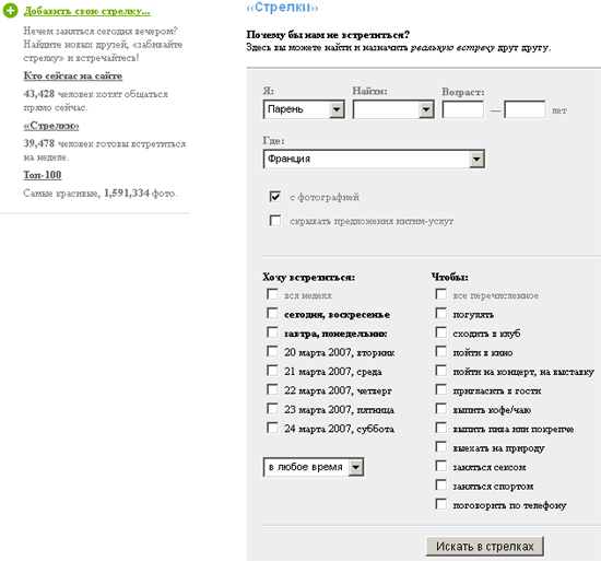 Открой у себя соответствующий раздел под названием "стрелки", пусть люди записываются, подрубрики и так понятны: кино, театр, парк дэз экспозисьон, батомуш, турэфель, булонь, периф, пюс...