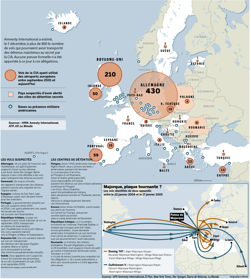 Un rapport du Conseil de l'Europe, présenté mercredi 7 juin, et dirigé par le parlementaire suisse Dick Marty, indique que quatorze Etats européens ont collaboré avec la CIA ou toléré le transfèrement par avions de terroristes présumés. La Pologne et la Roumanie sont aussi soupçonnées d'avoir abrité des centres de détention secrets de l'agence américaine du renseignement.
