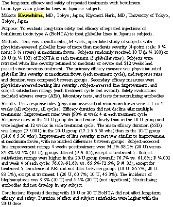 In one study, Japanese investigators presented data showing long-term efficacy and safety of botulinum toxin type A for glabellar lines, with response rates persisting through 64 weeks of treatment.